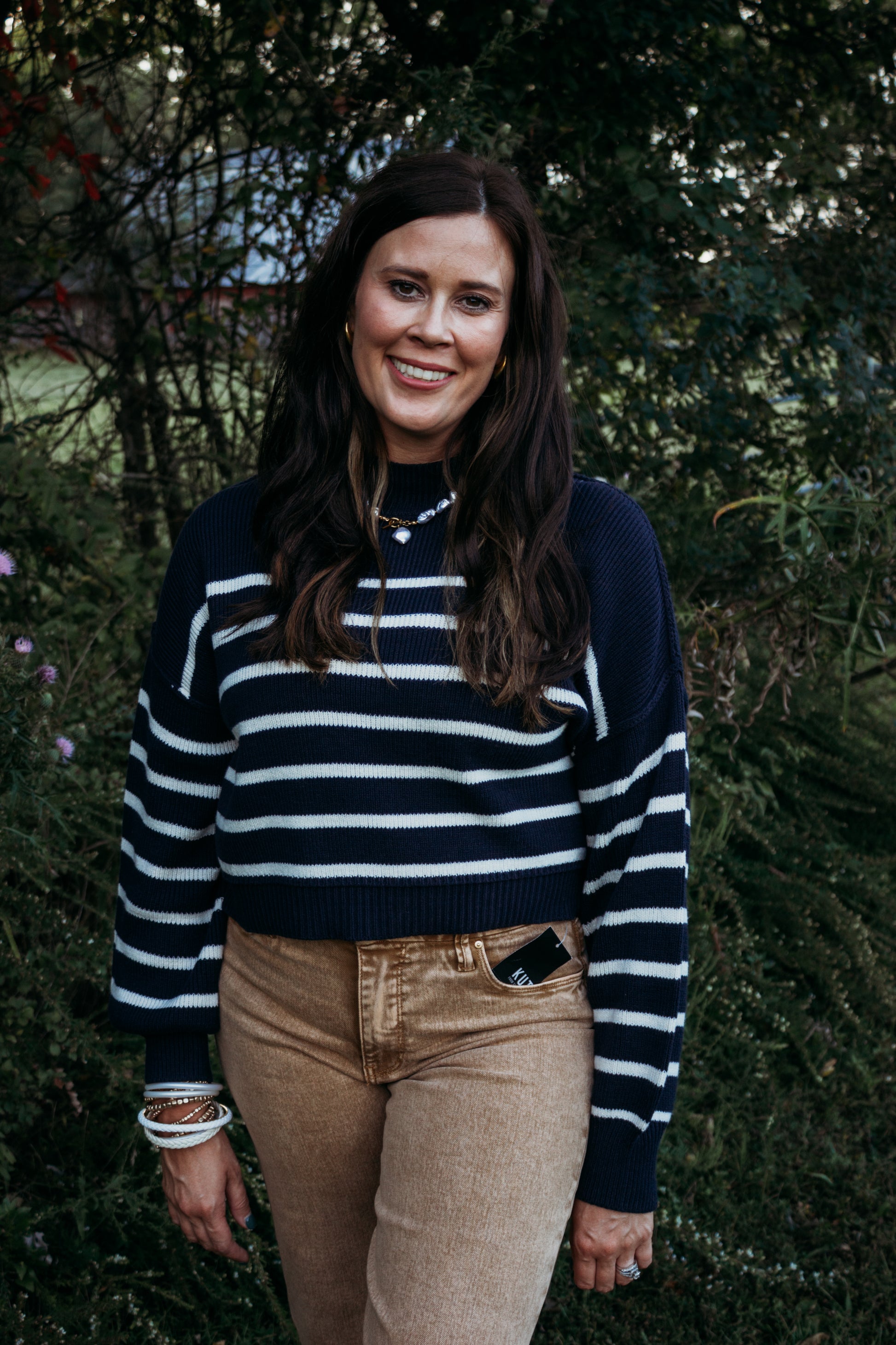 Stay cozy and stylish with this striped knit sweater featuring a chic mock neckline. The long sleeves and relaxed drop shoulder design create a laid-back, effortless look, while ribbed trim detailing at the cuffs and hem adds subtle structure. Lightweight and not lined, this sweater is perfect for layering or wearing on its own during cooler days.