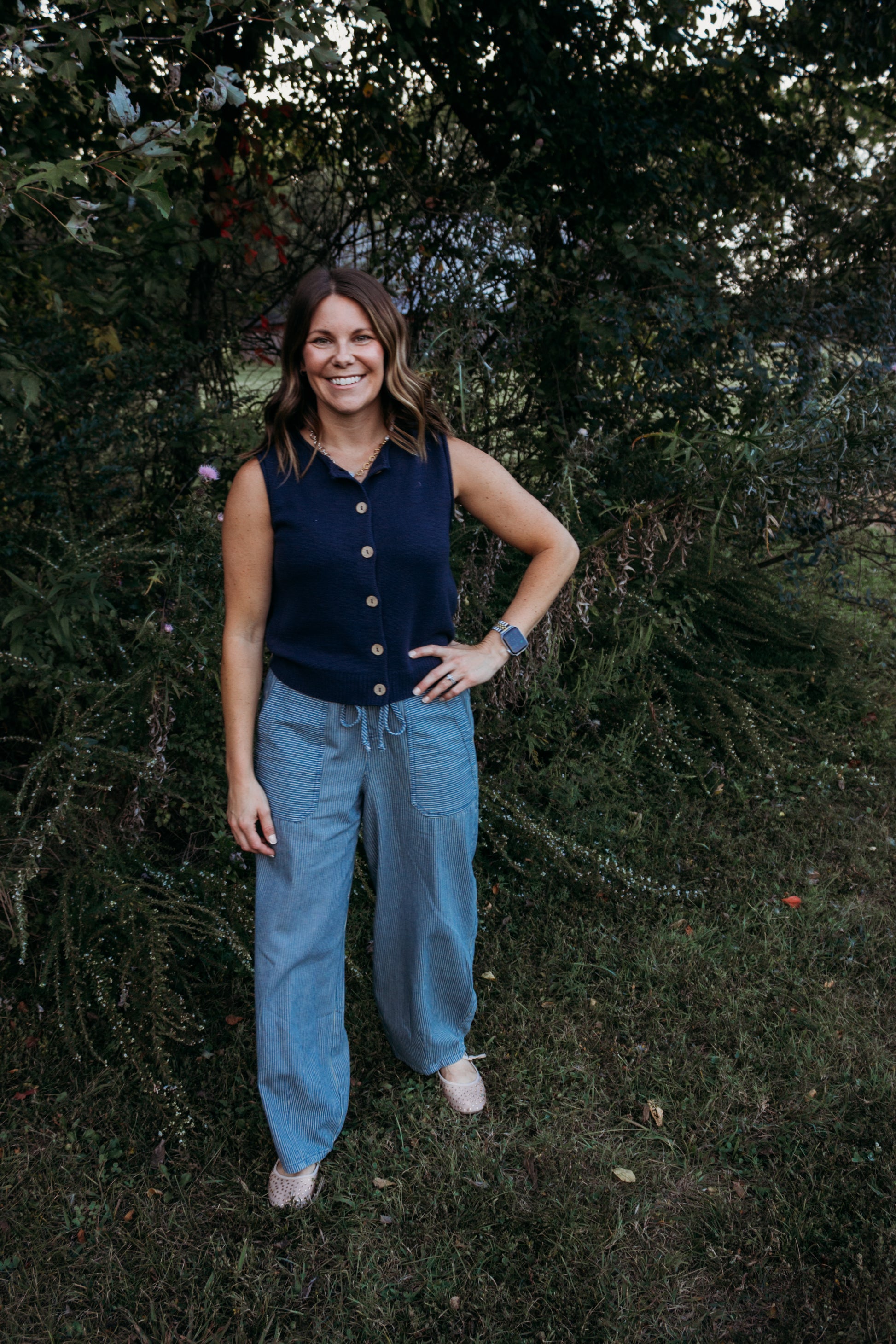 Elevate your layering game with this sleeveless knit cardigan vest in a deep navy hue. Designed with a classic round neckline and functional button-down front, it features raw edge detailing for a modern, laid-back vibe. Crafted from a soft sweater knit, this versatile vest is unlined, lightweight, and perfect for pairing over tees, blouses, or dresses for a chic transitional look.
