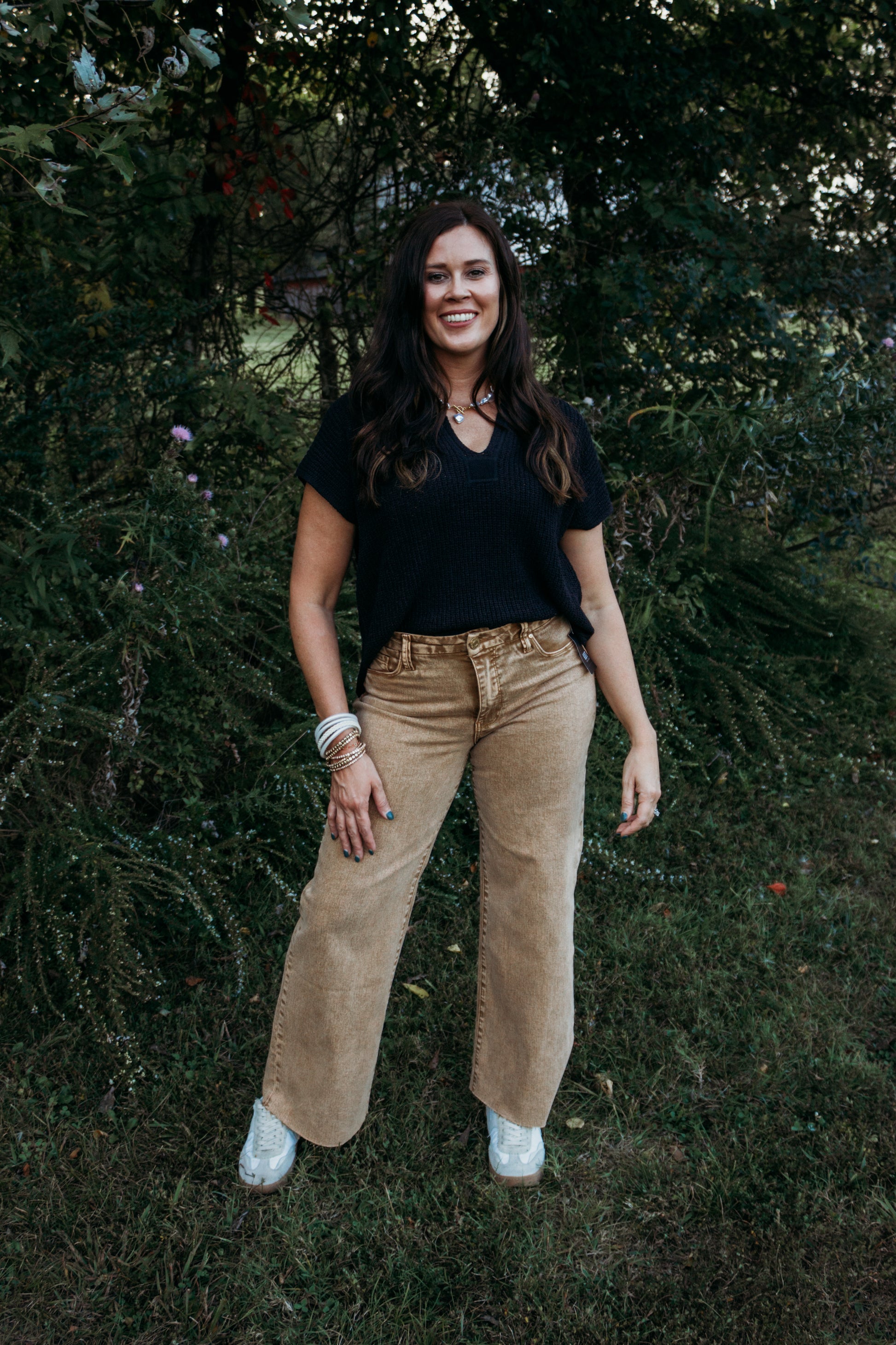 A chic and effortless staple, this solid black sweater knit top features a flattering split neckline, short batwing sleeves with extended shoulders, and raw edge detailing for a modern touch. Crafted from a soft knit, it’s unlined, lightweight, and perfect for pairing with denim or trousers for an elevated yet relaxed look.
