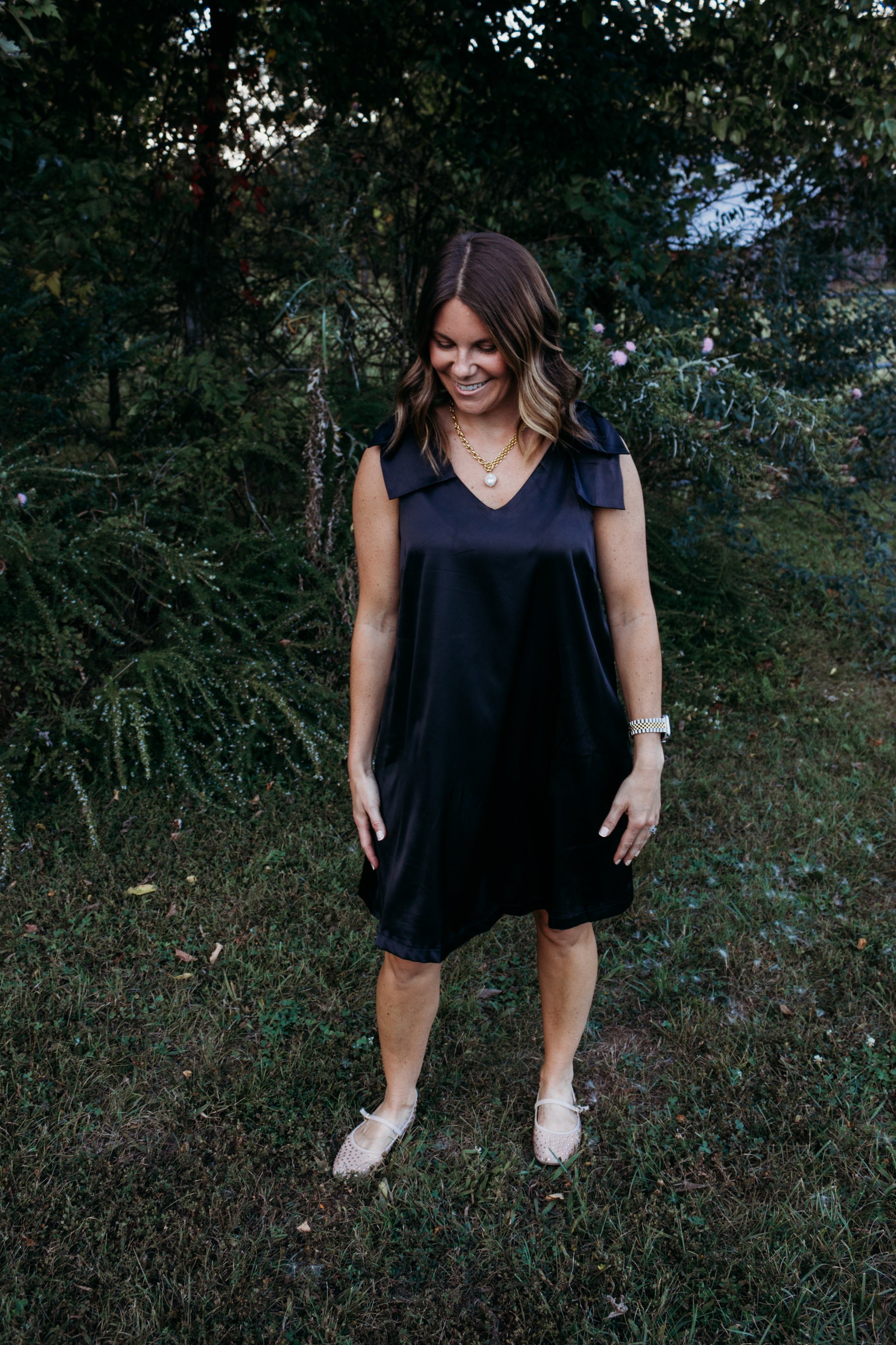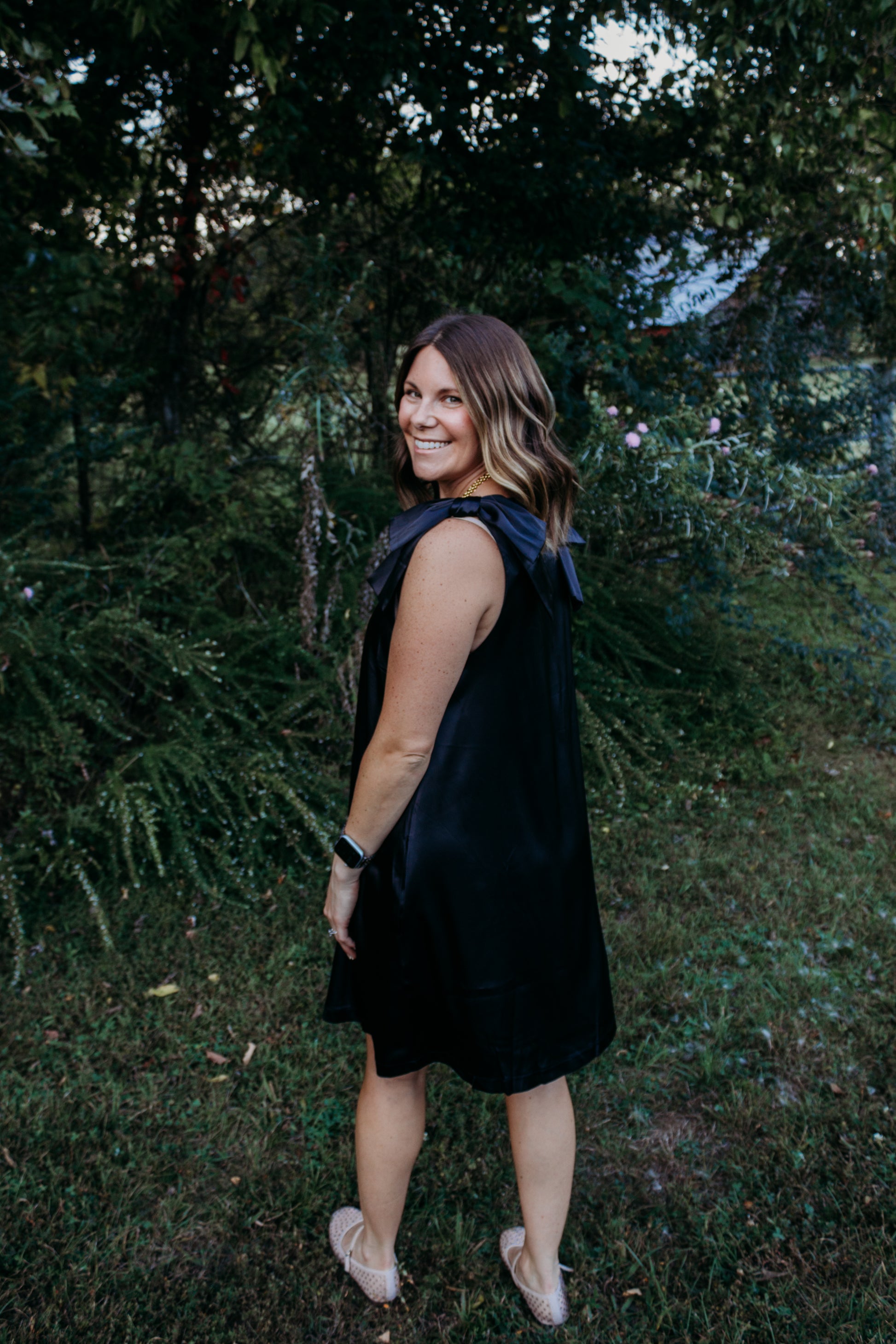 Effortlessly chic and timeless, this solid sleeveless mini dress is designed with charming bow details at the shoulders and a flattering V-neckline. Featuring side pockets for convenience and a fully lined, lightweight woven fabric for comfort, this piece is both stylish and practical. A true wardrobe essential, perfect for any occasion where you want to look polished yet playful.