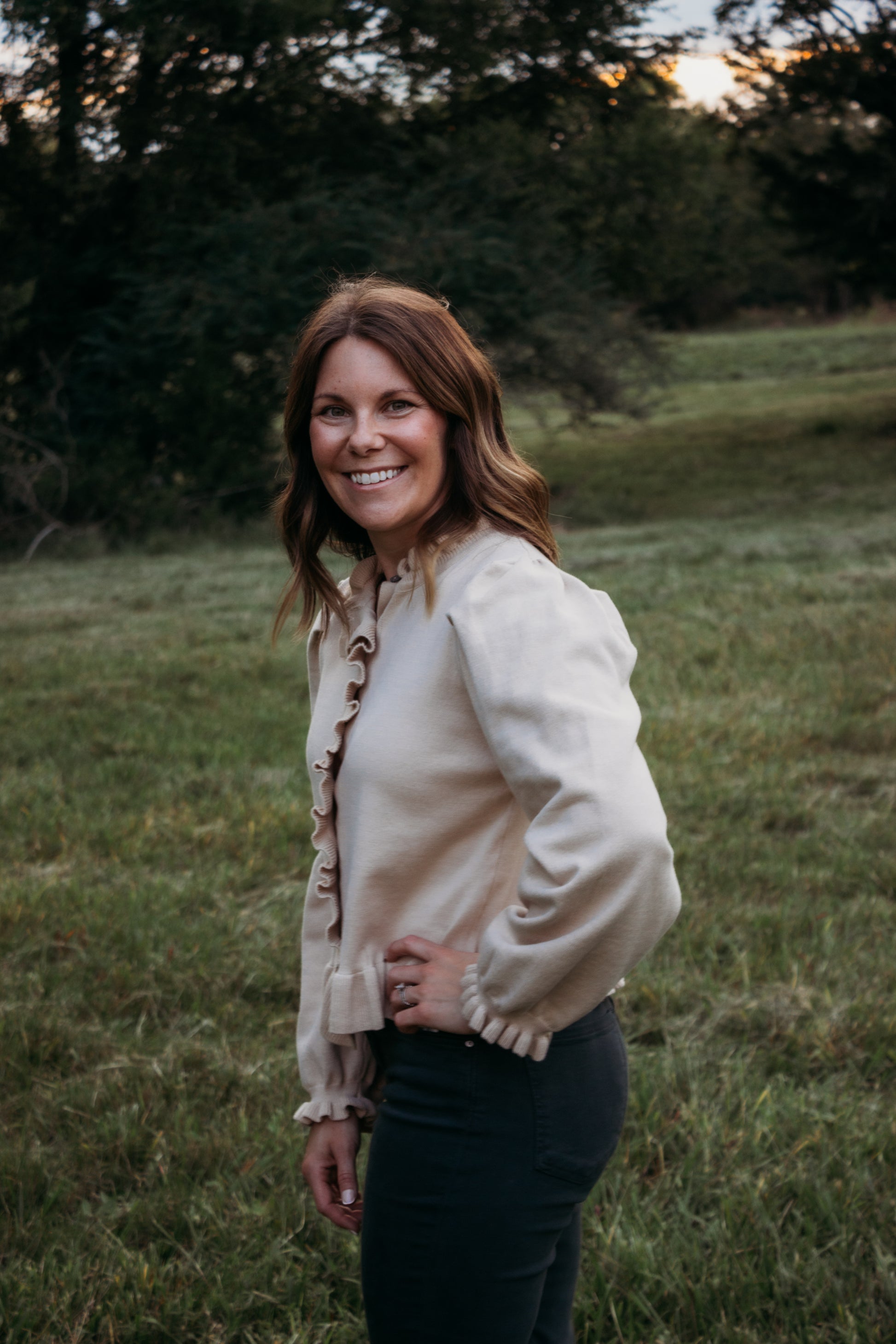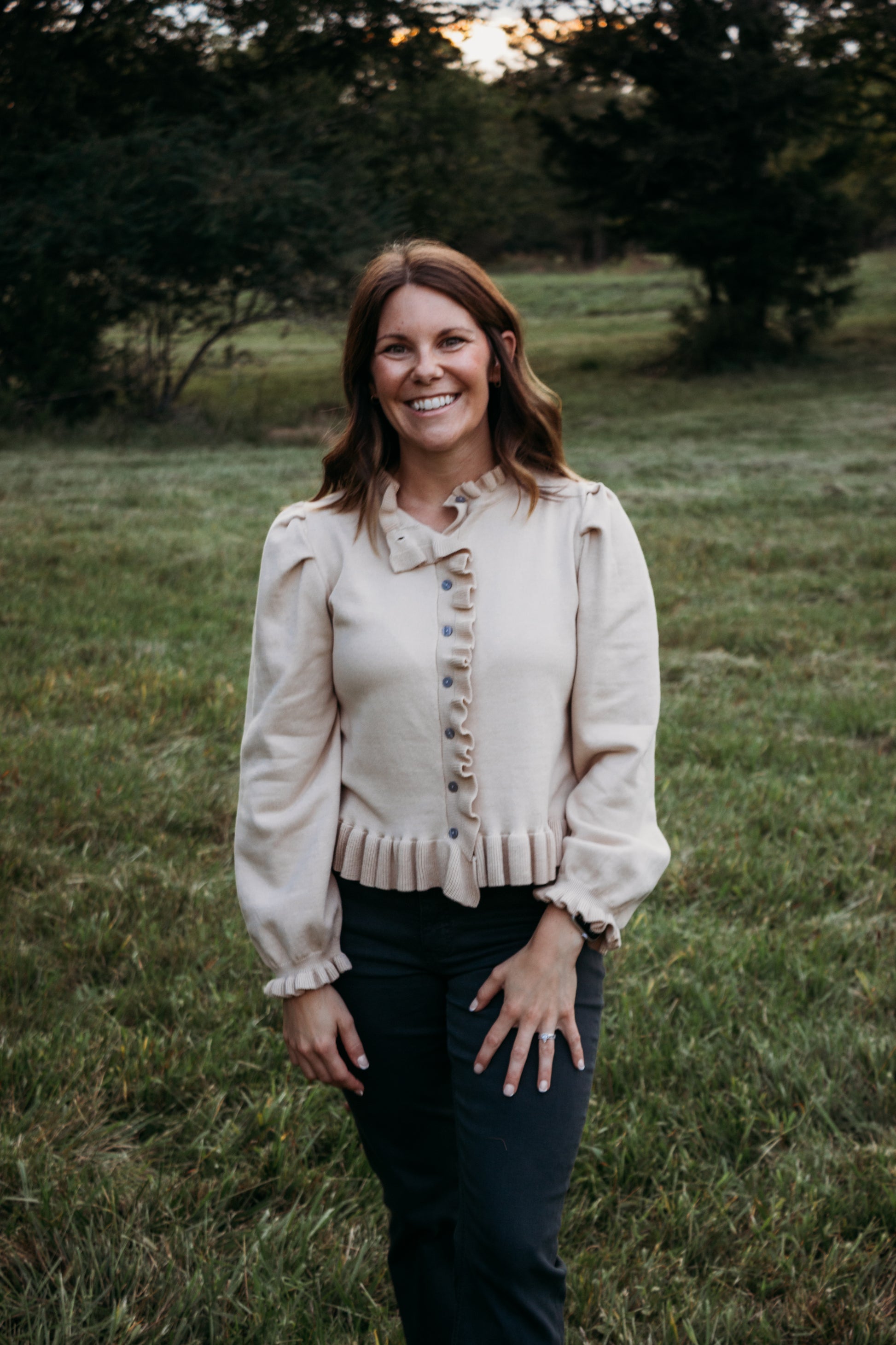 Feminine meets cozy in this long sleeve knit cardigan. Designed with delicate ruffle trim along the neckline, placket, hem, and cuffs, it adds a touch of charm to a timeless silhouette. The button-front closure offers versatile styling—wear it closed as a top or layered over your favorite basics. Crafted from a medium-weight, non-sheer knit in a neutral light taupe, this piece is the perfect balance of soft sophistication and everyday wearability.